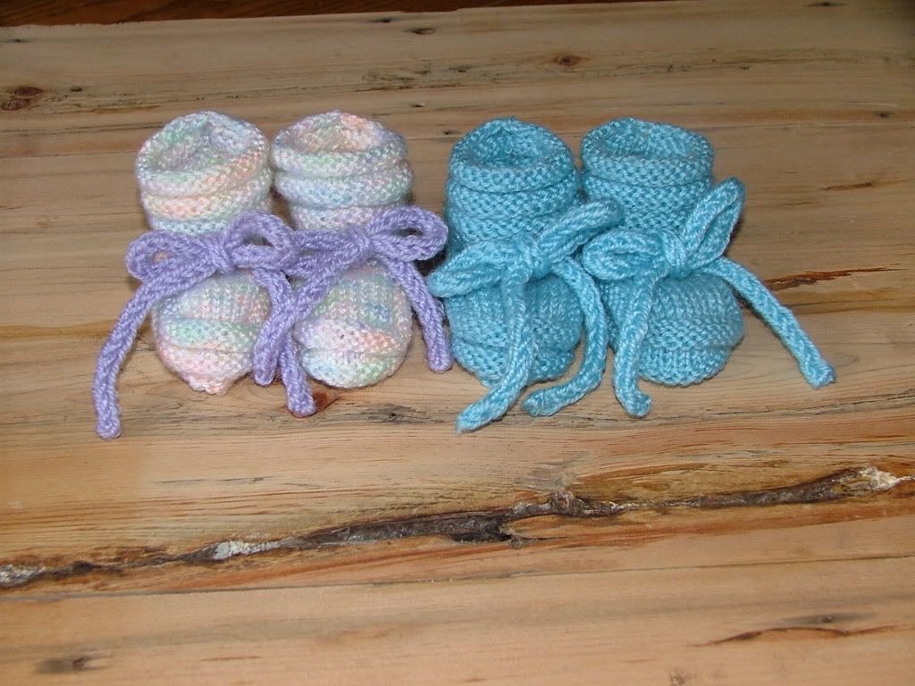 Her first projects were a couple pair of booties. Since we choose to not find out what we're having until birth, everything has to either be gender neutral in the beginning, or we make one of each. She chose to do one of each. As we were going through baby boxes, we found that we already have a pair of blue booties that were saved from Nathan, so the blue ones below will be given to our cousins baby boy, due about a week after ours.